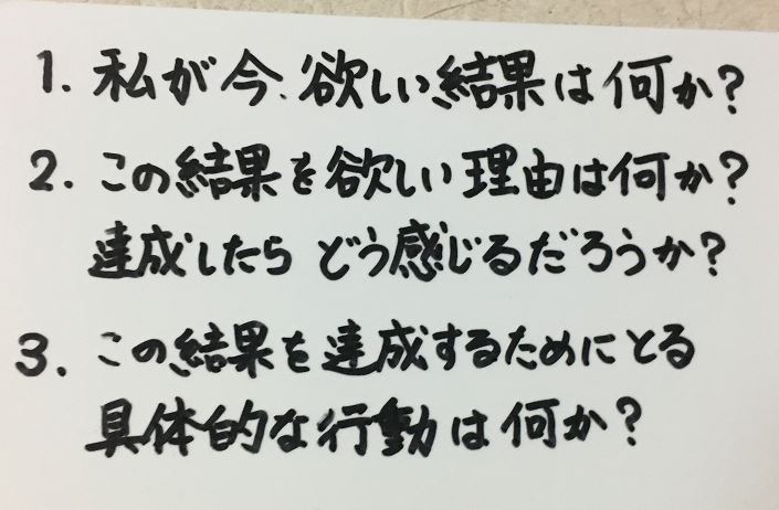 コーチング(NLP)の時の質問の基本は、クライアントからこの「欲しい結果」を質問して聞き出すことから始まります。